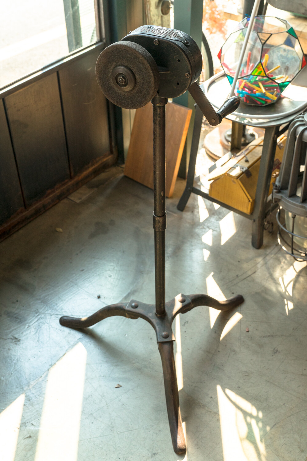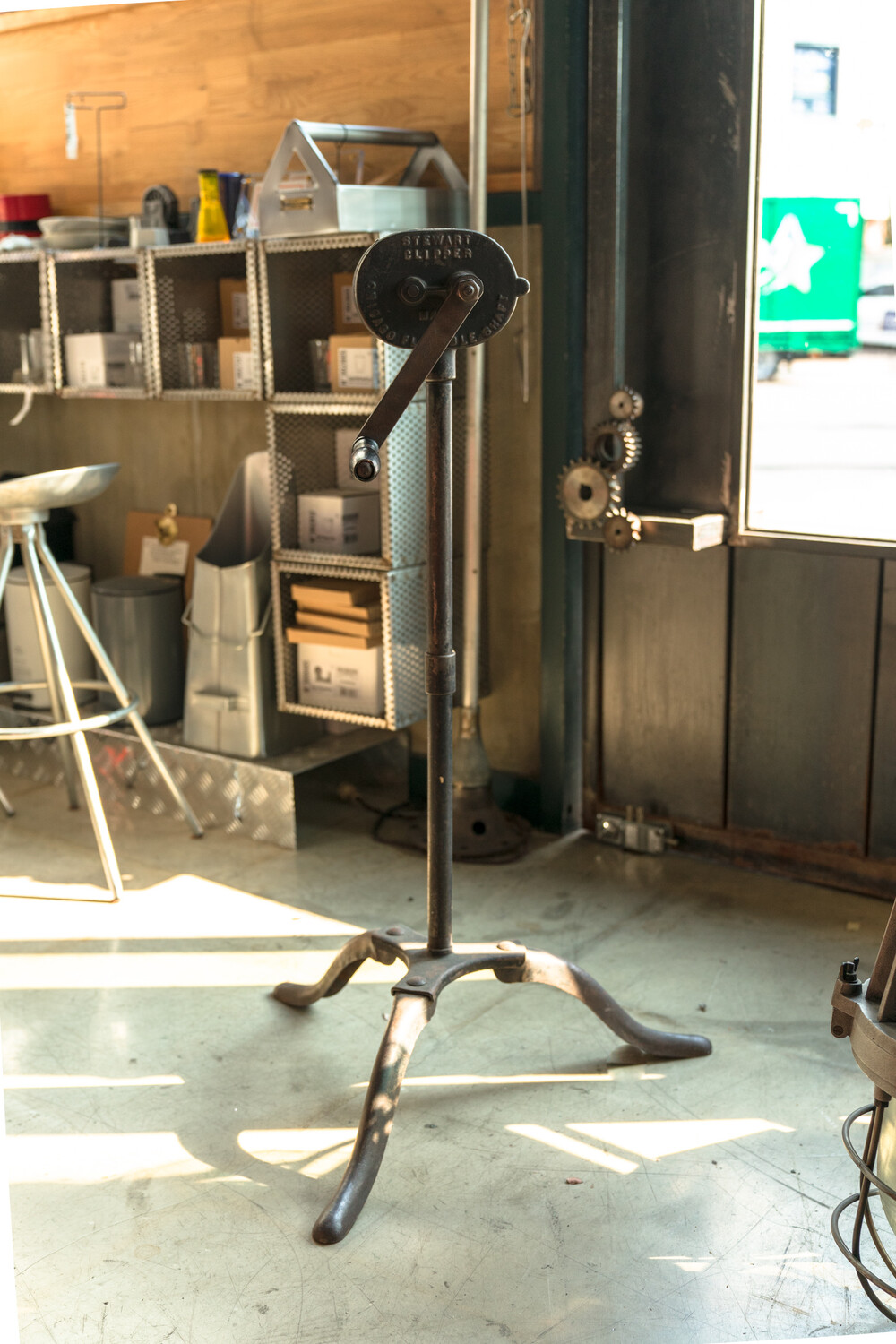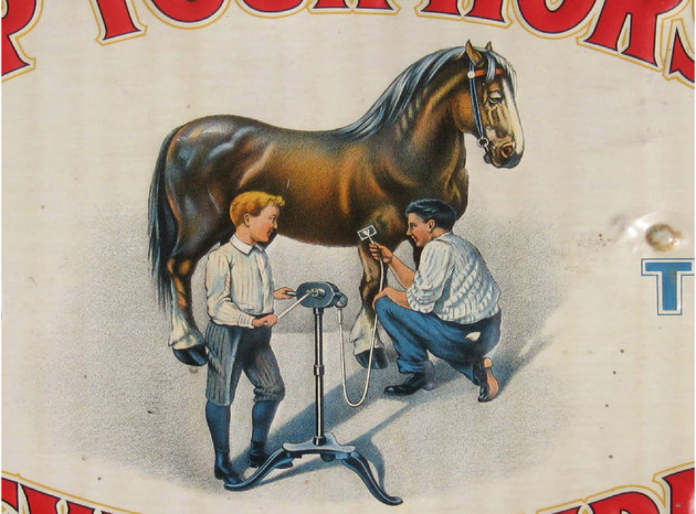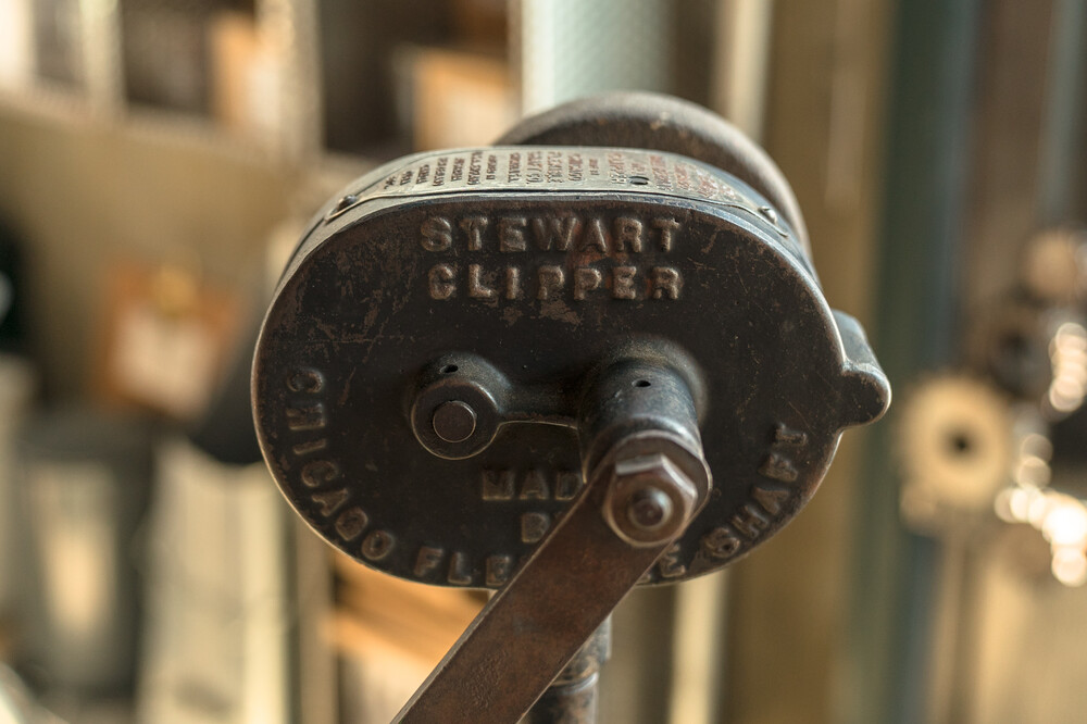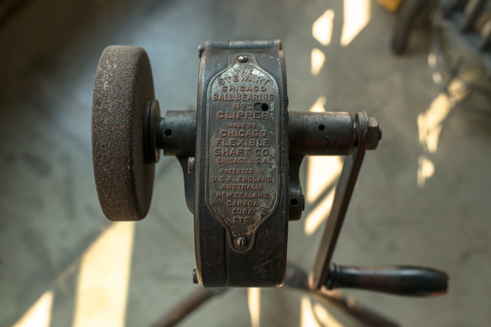 This is a Stewart Ball Bearing Horse Clipping machine which was manufactured by the Chicago Flexible Shaft Company in the United States. The machine features a wooden handled hand crank mechanism to power the clippers and a flexible shaft for ease of movement.The first horses to be clipped were war horses in the nineteenth century. Work horses were clipped to help with temperature regulation. In the winter, their long coats held sweat making them cold, and in the summer the hair resulted in them being warm. Clipping allow the horses to dry quickly after working, and increased the horse’s ability to work harder and longer. However, the removal of hair was costly when using hand clippers, and it was often debated whether the clipping impacted the well being of the horse to warrant being done. Hand crank powered flexible clippers such as the Stewart Ball Bearing was a solution to this debate.This machine belonged to the Stirling family who farmed at South Wyndham.Note the hand piece is missing.