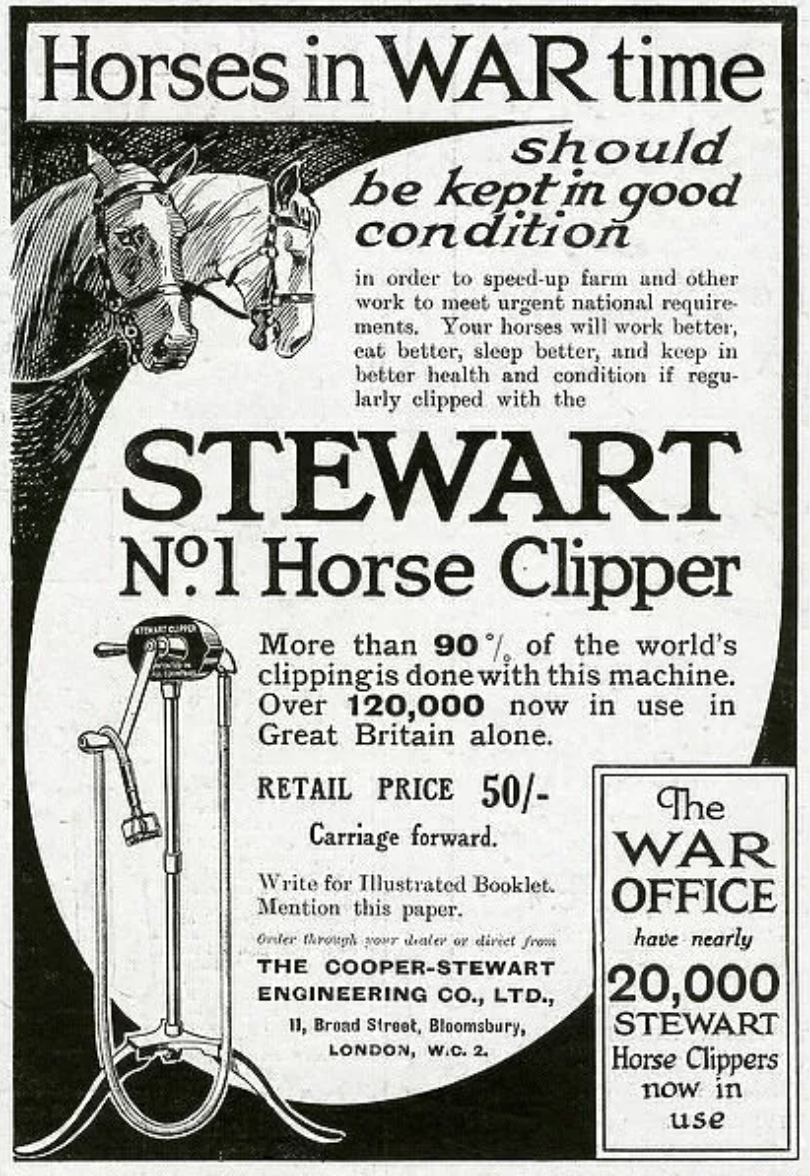 Brass makers plate at top: 'THESTEWARTCHICAGOBALL BEARINGNO.1CLIPPERMADE BYCHICAGOFLEXIBLESHAFT COCHICAGO U.S.A.PATENTED INU.S.A.. ENGLANDAUSTRALIANEW ZEALANDCANADACUBAETC'Pressed into side of machine: 'STEWART CLIPPER MADE BY CHICAGO FLEXIBLE SHAFT'