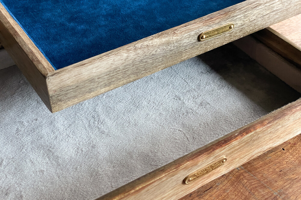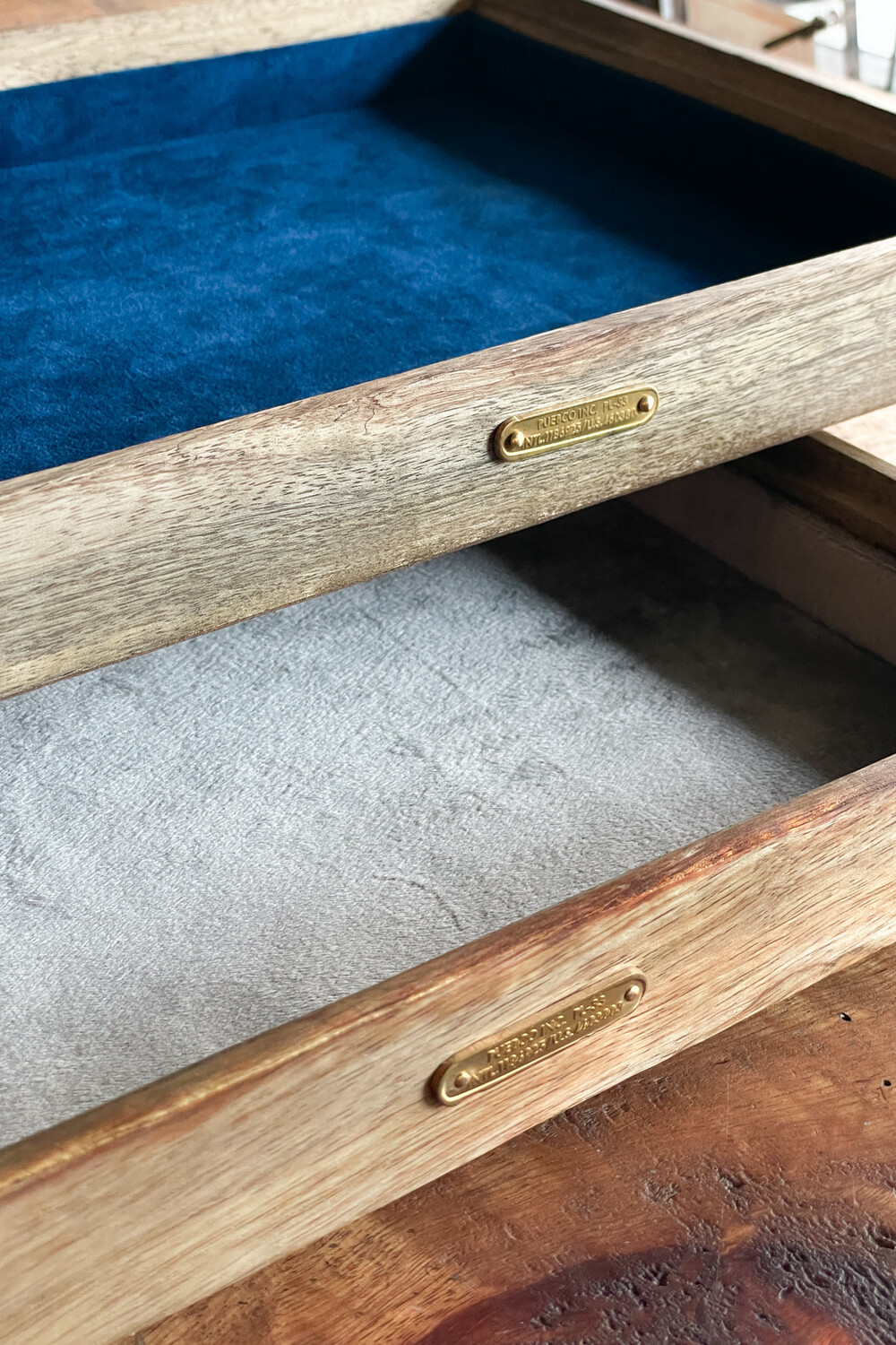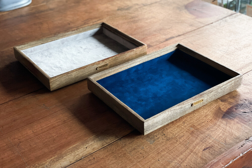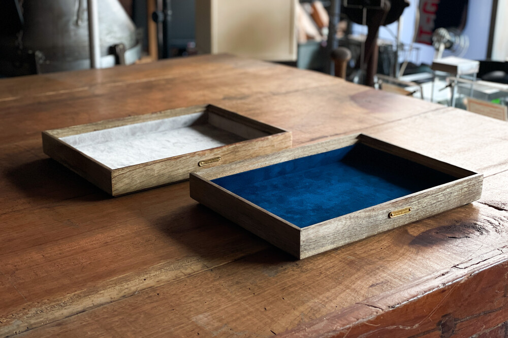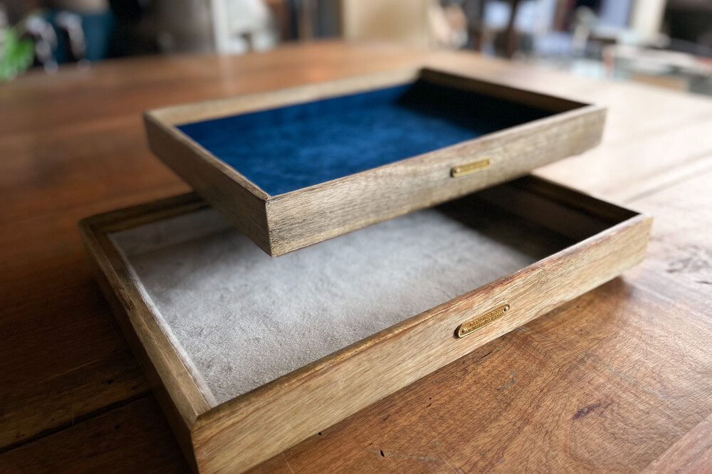 元のアイデアは古い宝飾店で使われていたトレーで、ガラスショーケースから宝石を取り出して顧客に間近で見せるためのもの。店舗什器として使っていただくもよし、家の玄関やリビングなどでアクセサリーや貴重品を置くトレーとしても使っていただけると思います。