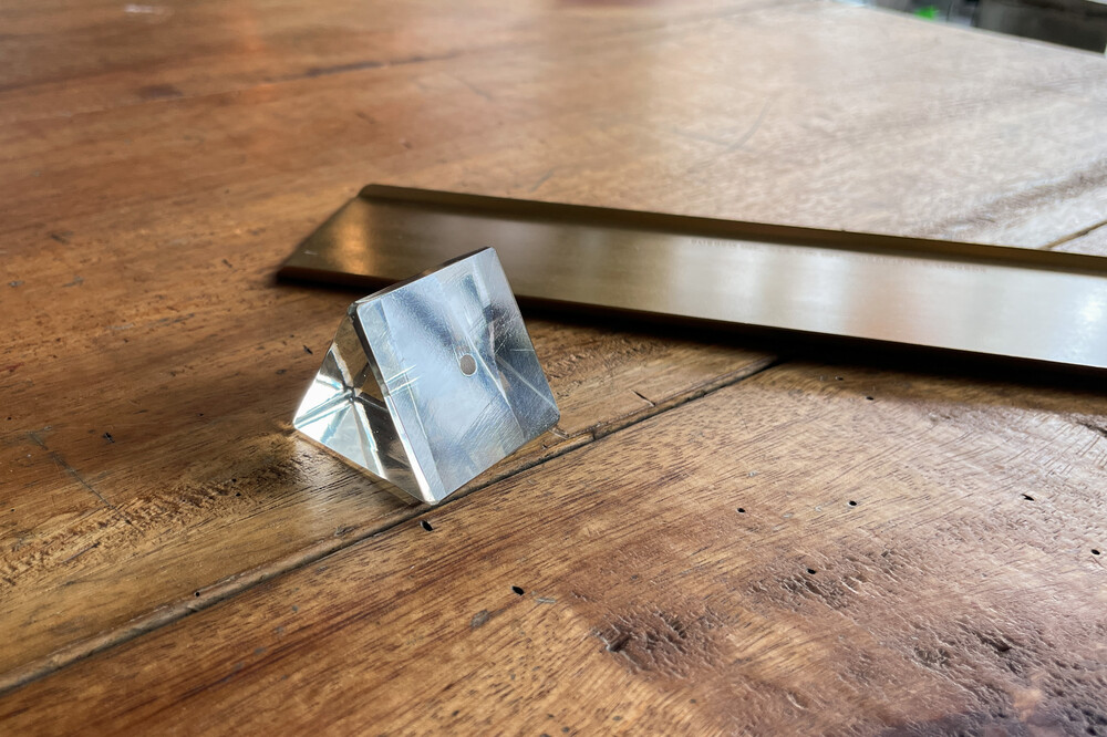 光の屈折率などを調べるガラス製のプリズムに穴をあけて作っています。